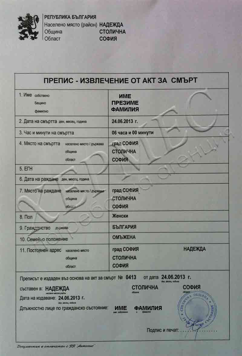 Bułgarski akt zgonu (Смъртен акт) to oficjalny dokument potwierdzający śmierć osoby na terenie Bułgarii. Jest on sporządzany i wydawany przez właściwy urząd stanu cywilnego na podstawie zgłoszenia zgonu, które może zostać dokonane przez rodzinę lub instytucję (np. szpital). Dokument zawiera najważniejsze informacje dotyczące zmarłego, daty, miejsca i okoliczności śmierci oraz dane osoby zgłaszającej zgon.