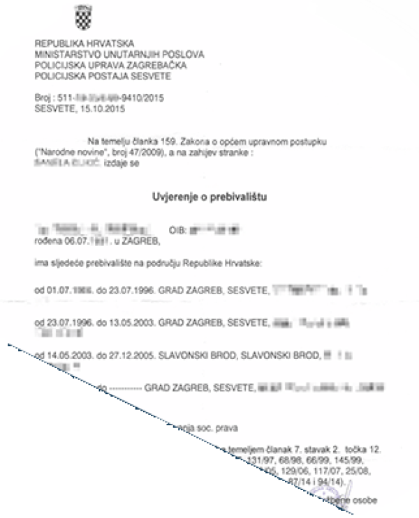 Zaświadczenie o miejscu zamieszkania w Chorwacji (Potvrda o prebivalištu) jest wydawane przez Ministerstwo Spraw Wewnętrznych Republiki Chorwacji (Ministarstvo unutarnjih poslova – MUP) lub lokalne komendy policji (Policijska uprava), które pełnią funkcję administracyjną. Dokument potwierdza aktualny adres zameldowania danej osoby w Chorwacji oraz okres obowiązywania meldunku.