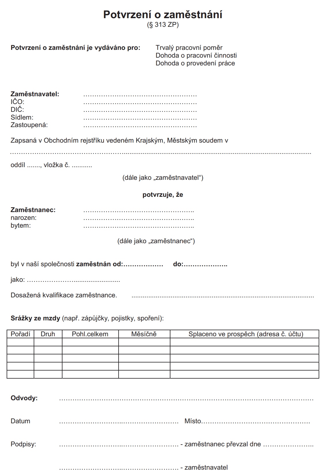 Czeskie świadectwo pracy (Potvrzení o zaměstnání) to dokument wystawiany przez pracodawcę po zakończeniu stosunku pracy. Potwierdza on przebieg zatrudnienia, obejmuje daty rozpoczęcia i zakończenia pracy, zajmowane stanowisko, podstawę zatrudnienia oraz informacje o świadczeniach.