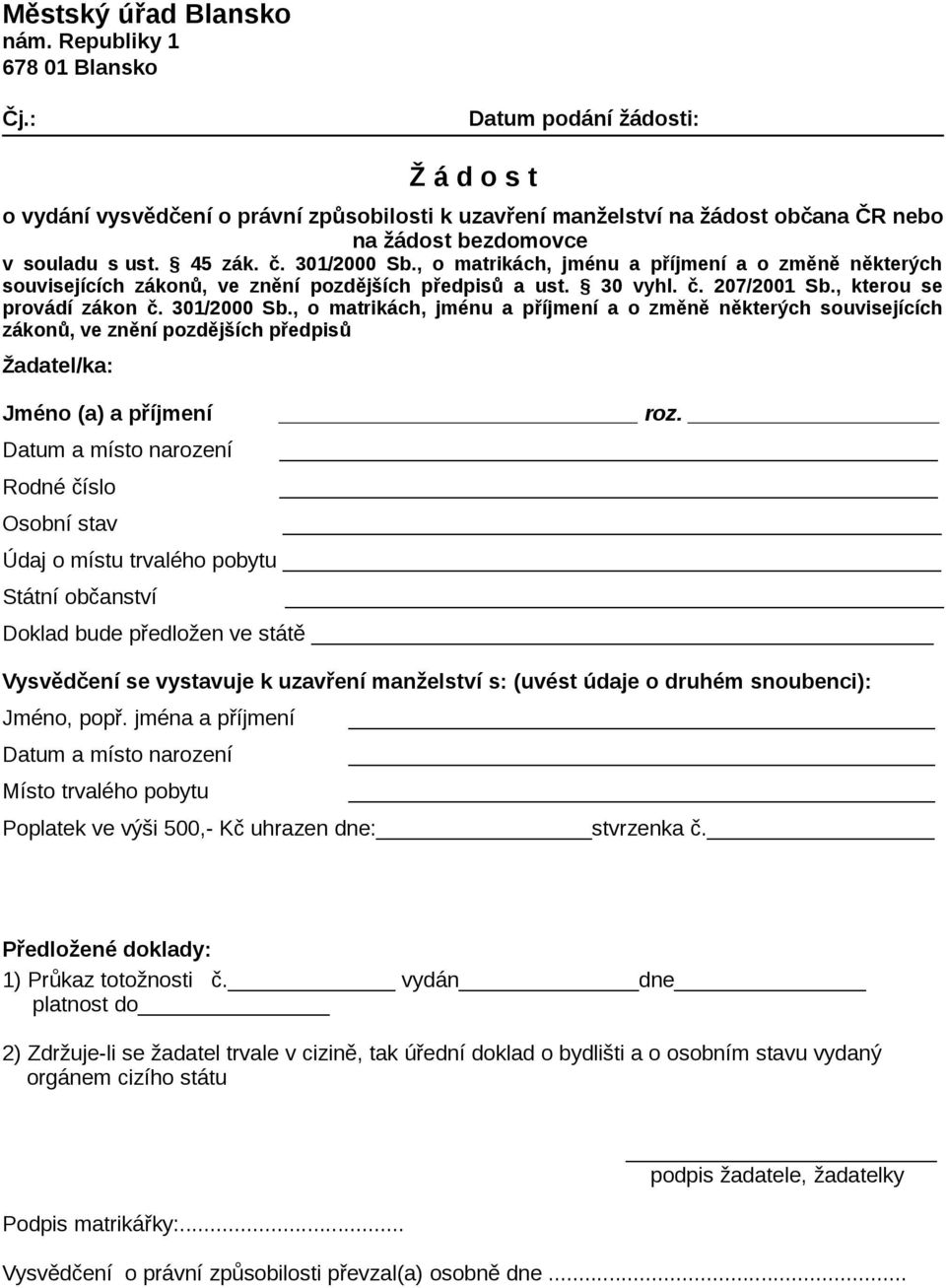 Zaświadczenie o stanie cywilnym (Potvrzení o rodinném stavu) wydawane jest przez czeski urząd stanu cywilnego (Matriční úřad) i potwierdza aktualny stan cywilny osoby – np. kawaler, panna, rozwiedziony(a), wdowiec/wdowa. Dokument ten jest często wymagany przez polskie urzędy przy zawieraniu małżeństwa z cudzoziemcem, podczas procedur imigracyjnych lub legalizacyjnych.