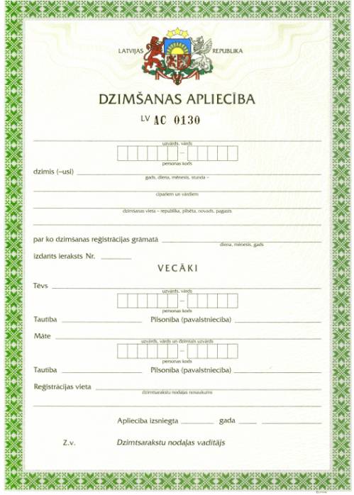 Łotewski akt urodzenia (Dzimšanas apliecība) to oficjalny dokument urzędowy wystawiany przez Dzimtsarakstu nodaļa, czyli łotewski odpowiednik urzędu stanu cywilnego.