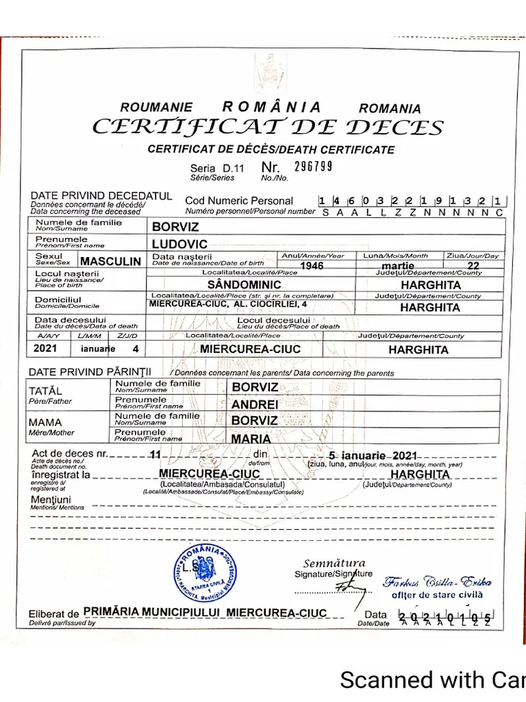Oficjalne informacje o rumuńskim akcie zgonu dostępne są na stronie: