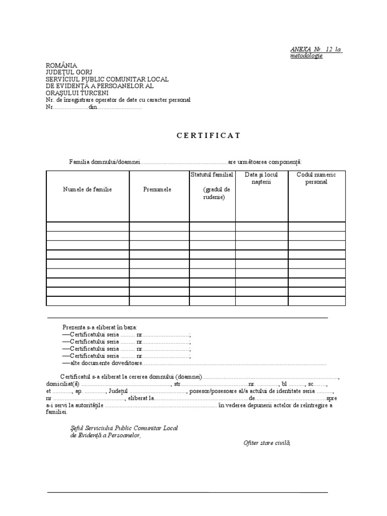 Rumuńskie zaświadczenie o stanie cywilnym (Certificat de stare civilă) to oficjalny dokument administracyjny potwierdzający sytuację rodzinną danej osoby. Wydaje go Serviciul Public Comunitar Local de Evidenţă a Persoanelor właściwy dla miejsca zameldowania wnioskodawcy.