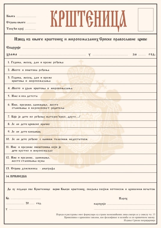 Serbski akt chrztu to dokument potwierdzający przyjęcie sakramentu chrztu w obrządku prawosławnym. Wystawiany jest przez właściwą parafię Serbskiej Cerkwi Prawosławnej i zawiera podstawowe dane osobowe dziecka, rodziców oraz chrzestnych. Jest często wymagany przy zawieraniu małżeństw wyznaniowych (zarówno w Polsce, jak i za granicą), a także przy potwierdzaniu tożsamości lub ubieganiu się o inne dokumenty kościelne.