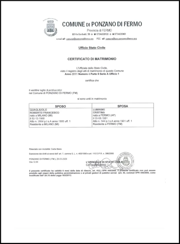 Certificato di Matrimonio – przykład