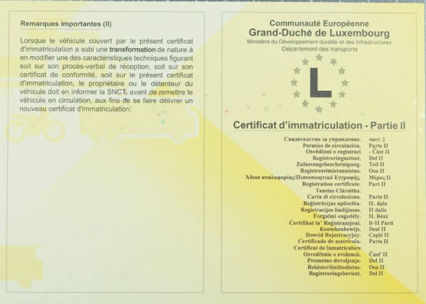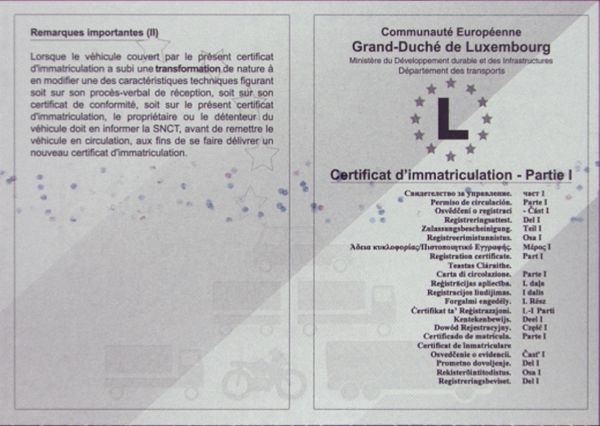 Luksemburski dowód rejestracyjny składa się z 2 części: szary Certificat d’immatriculation Partie I i żółty Certificat d’immatriculation Partie II. Tłumaczenia obu dokumentów są wymagane do rejestracji samochodu sprowadzanego z Luksemburgu.