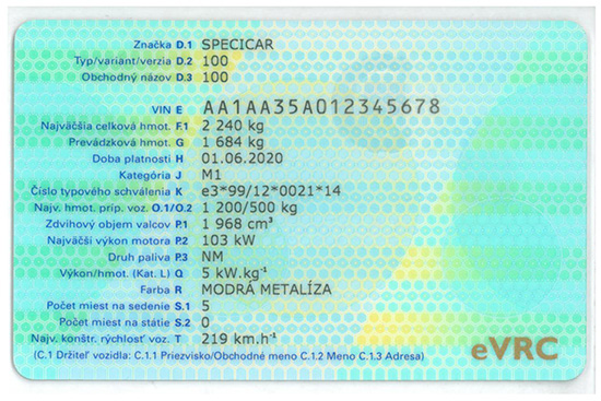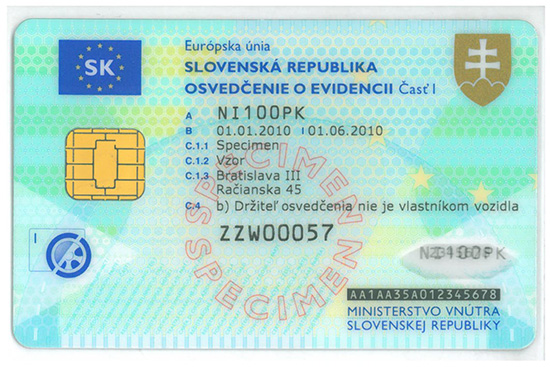 Osvedčenie o evidencii – časť I ma formę plastikowej karty i zawiera ogólne informacje o pojeździe: model, marka, rok produkcji, masa, pojemność silnika itd. Oraz informacje o właścicielu pojazdu: imię, nazwisko, adres i numer ID.