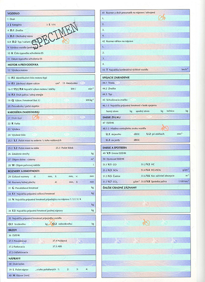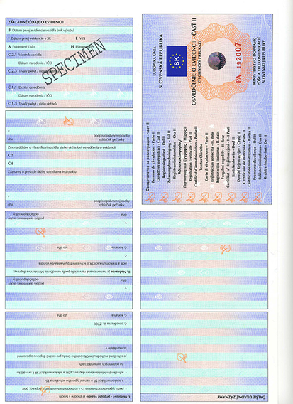 Słowacki dowód rejestracyjny dla pojazdów mechanicznych składa się z dwóch dokumentów: Osvedčenie o evidencii - časť I i Osvedčenie o evidencii - časť II. Dodatkowo występuje jeszcze czeska karta techniczna pojazdu.